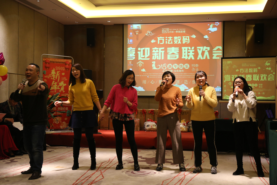 中午的午餐,大家推杯換盞,開懷暢飲,共話新年。伴隨著歡快的歌舞,2018年方法數碼迎新聯歡會也正式拉開了序幕。多才多藝的方法人,給我們展現了一場場別開生面的表演,歌曲、舞蹈、小品等形式多樣的文藝節目,場場都獲得滿堂喝彩,掌聲不斷。